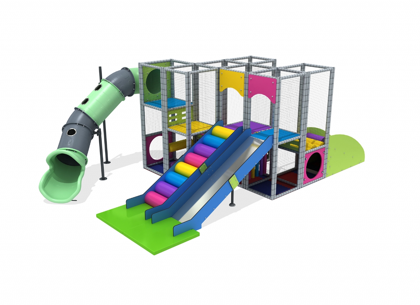 Designul trambulinei de interior este compact și sigur, fiind fabricat din materiale rezistente, ușor de întreținut și perfect adaptat pentru spații interioare. De asemenea, instalarea este simplă și rapidă, ceea ce face ca produsul să fie flexibil și ușor de integrat în diverse medii de joacă.