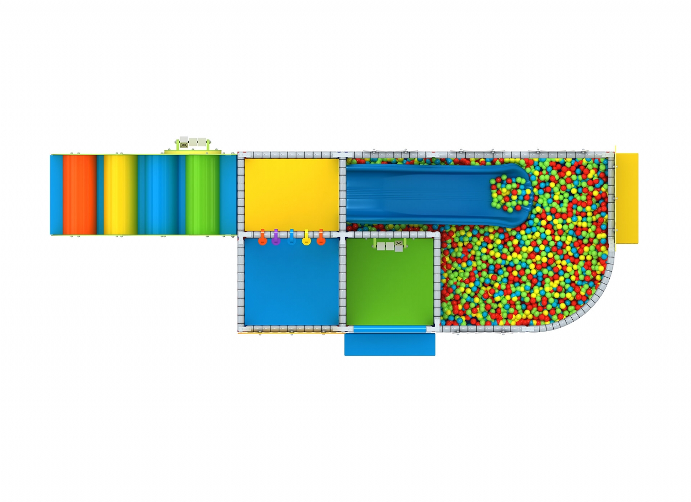 Piscina cu bile adaugă un element clasic de joacă, oferind o zonă de relaxare și distracție sigură, în timp ce trambulina contribuie la dezvoltarea echilibrului și forței musculare. Jocurile interactive integrate sunt o oportunitate excelentă pentru socializare și interacțiune între copii, făcând acest ansamblu ideal pentru grupuri mai mari.