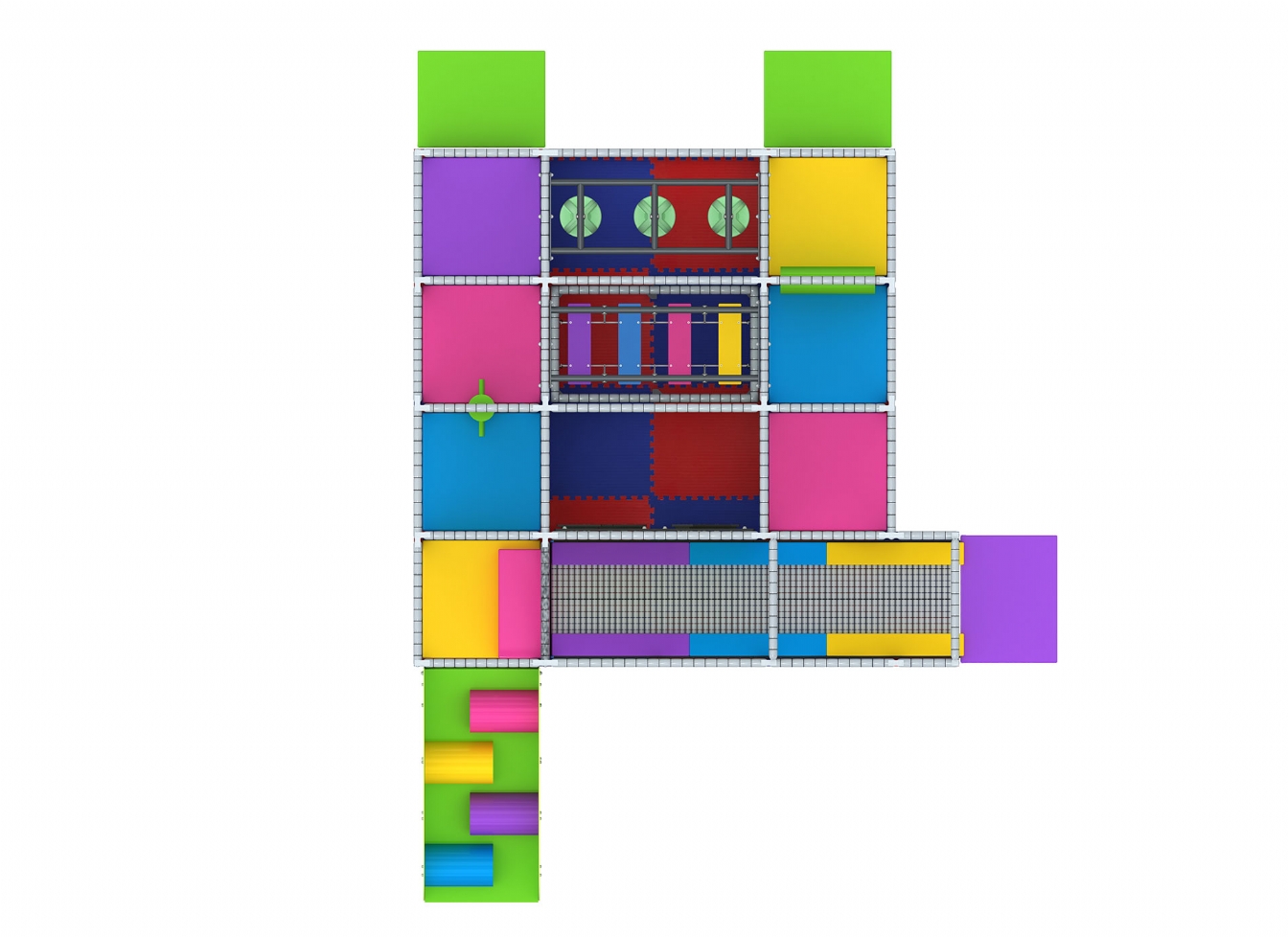 Piscina cu bile adaugă un element clasic de joacă, oferind o zonă de relaxare și distracție sigură, în timp ce trambulina contribuie la dezvoltarea echilibrului și forței musculare. Jocurile interactive integrate sunt o oportunitate excelentă pentru socializare și interacțiune între copii, făcând acest ansamblu ideal pentru grupuri mai mari.