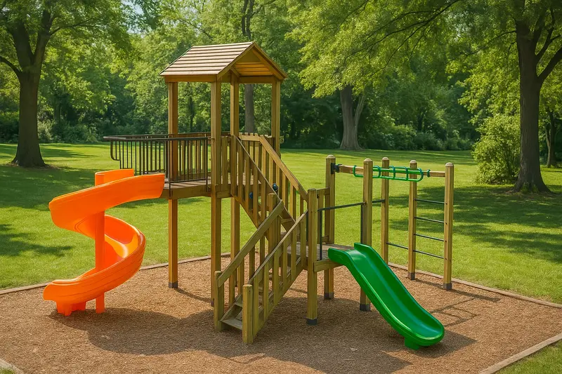 Echipamentele de joacă din lemn creează medii sociale sigure, pentru copii. Materialele din lemn de primă clasă sunt utilizate pentru echipamente. Echipamentele de joacă din lemn fac locurile de joacă parte din natura sa, iar copiii simt textura din lemn în timp ce se joacă.
