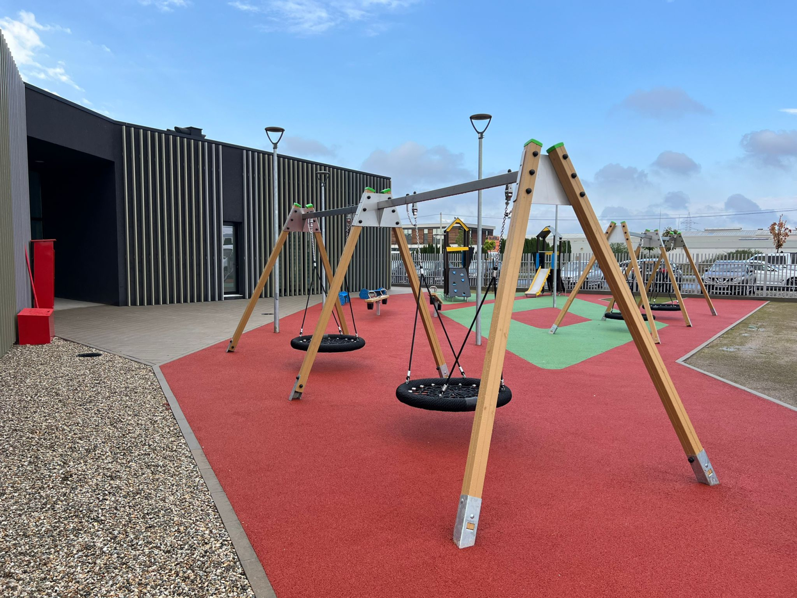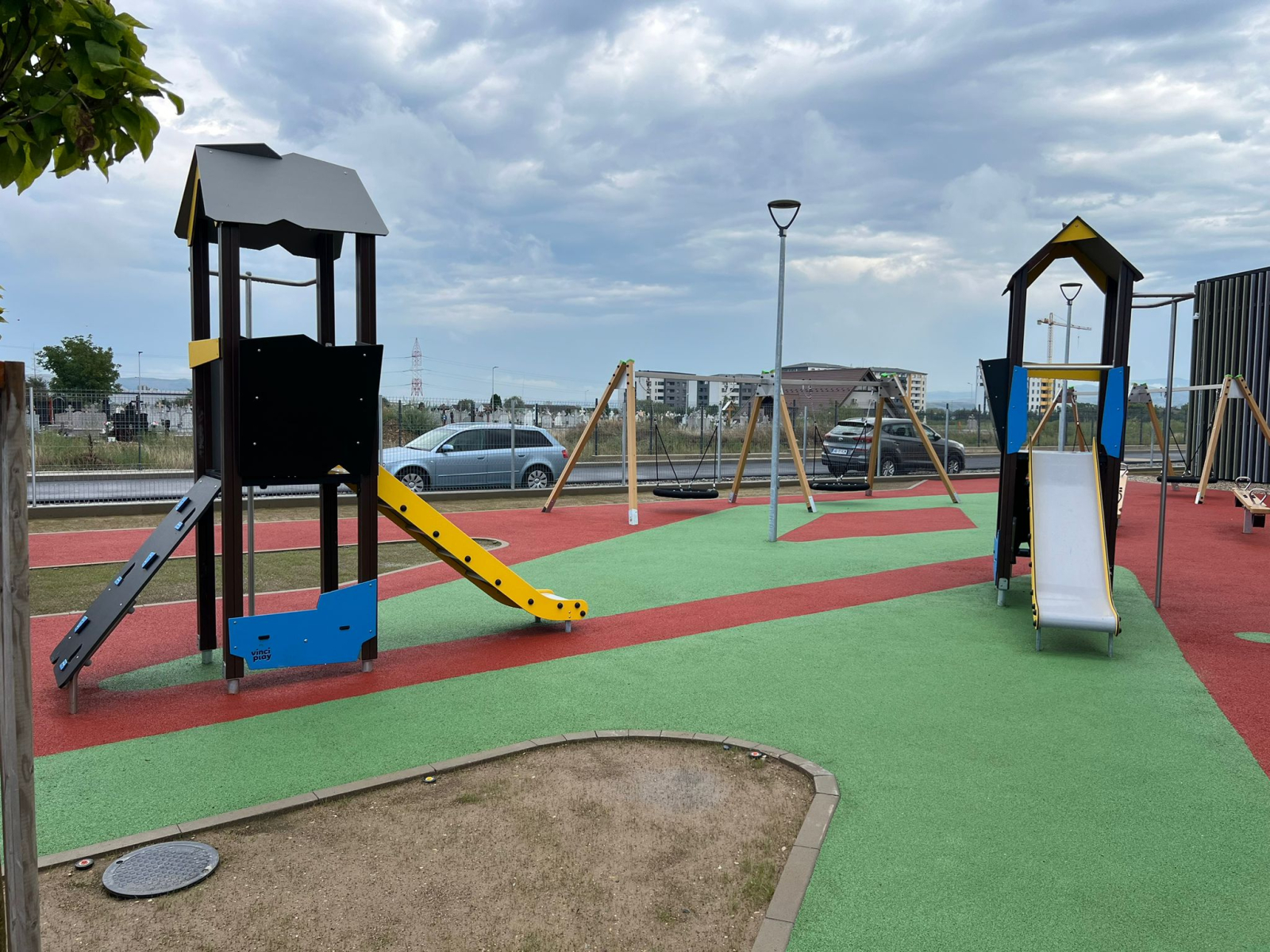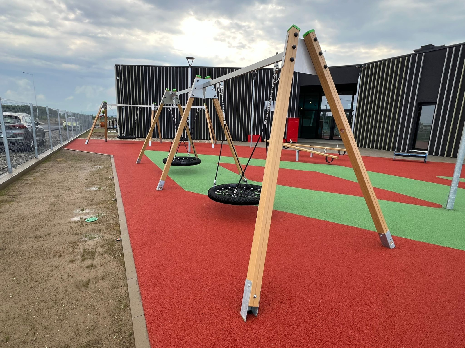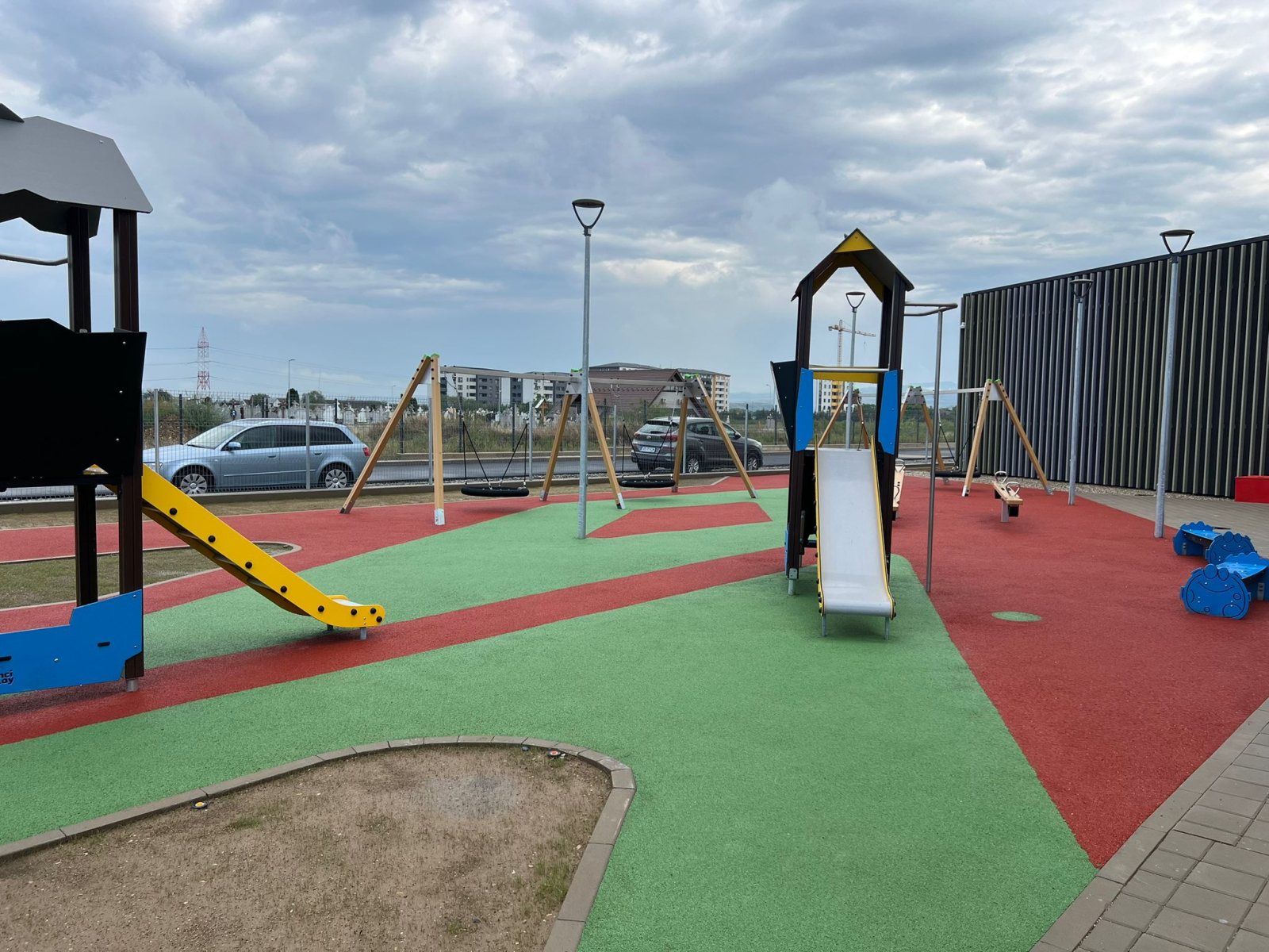 Amenajare loc de joacă exterior, format dintr-un ansamblu de echipamente din lemn si metal cu activități, balansoare si leagane în Sebes, Judetul Alba.