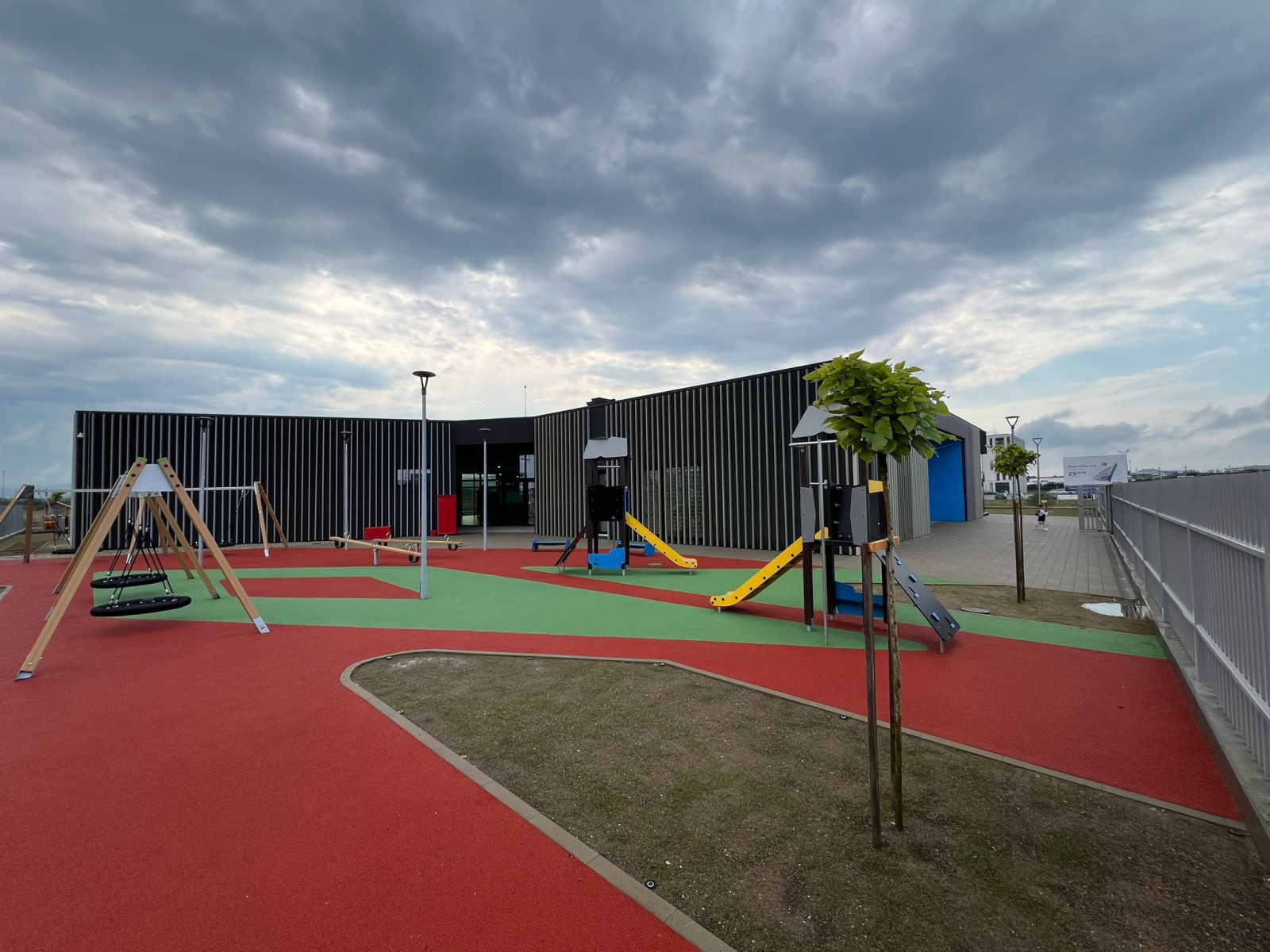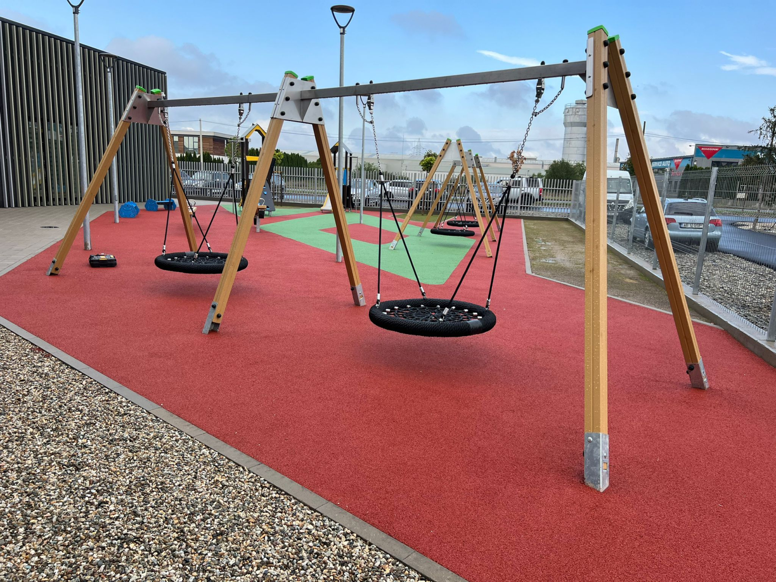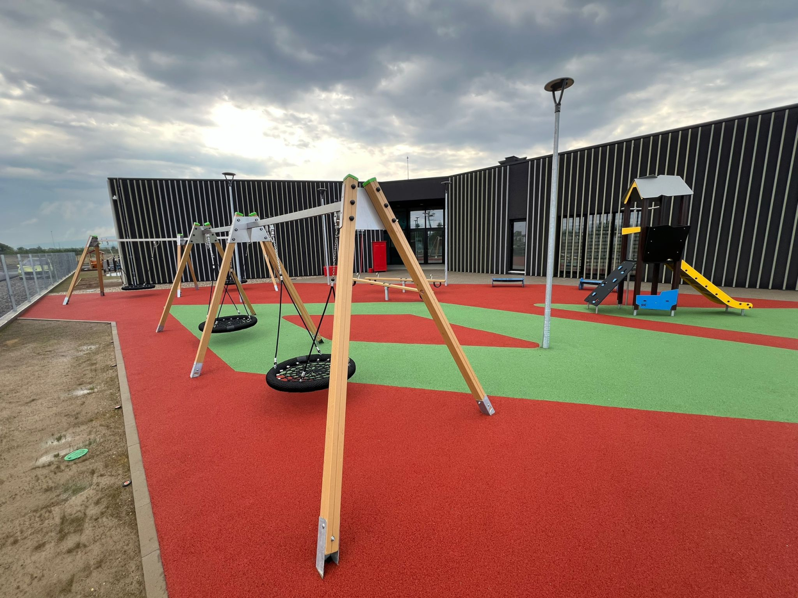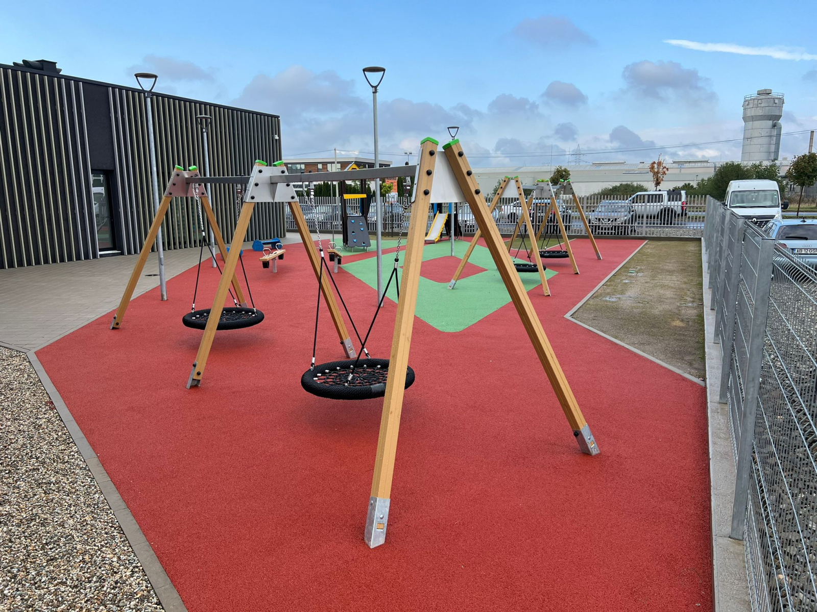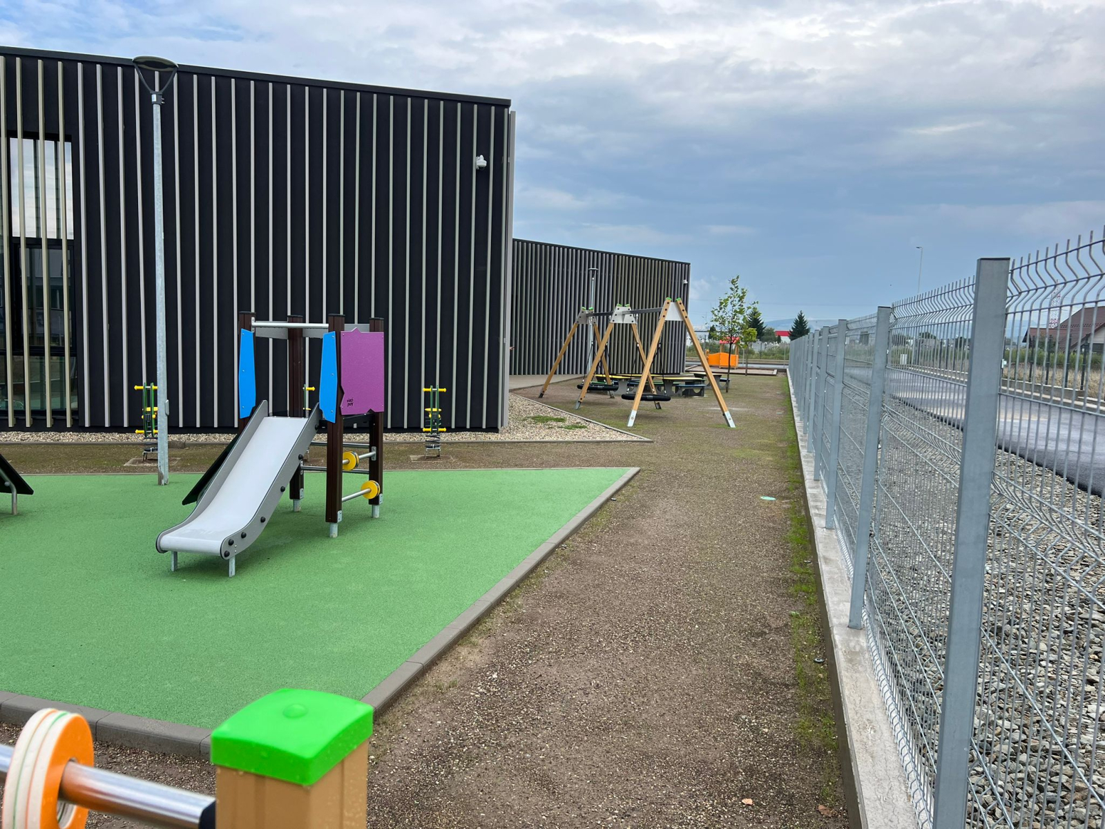 Amenajare loc de joacă exterior, format dintr-un ansamblu de echipamente din lemn si metal cu activități, balansoare si leagane în Sebes, Judetul Alba.