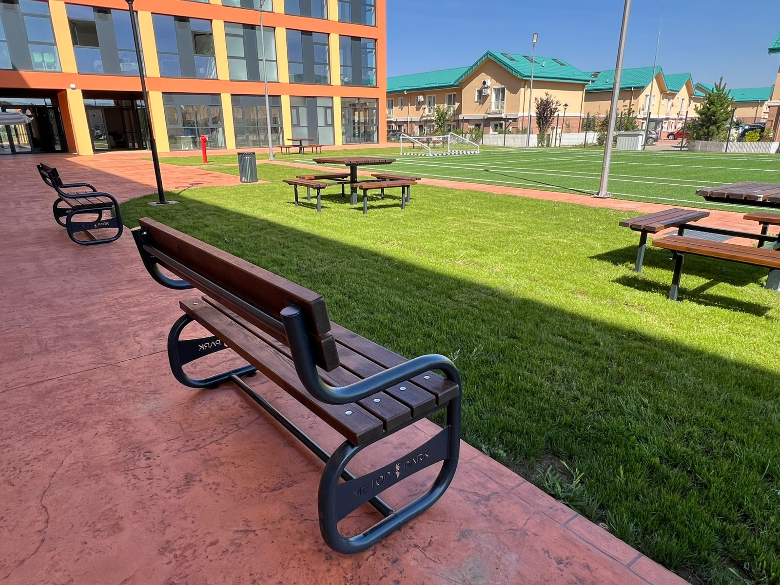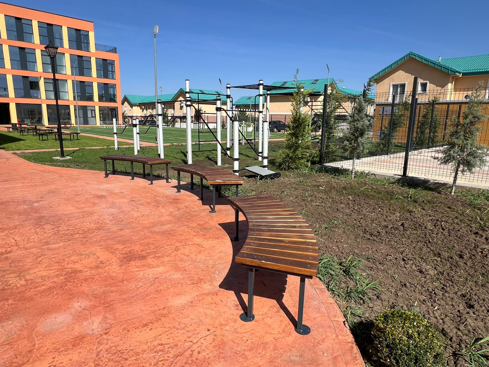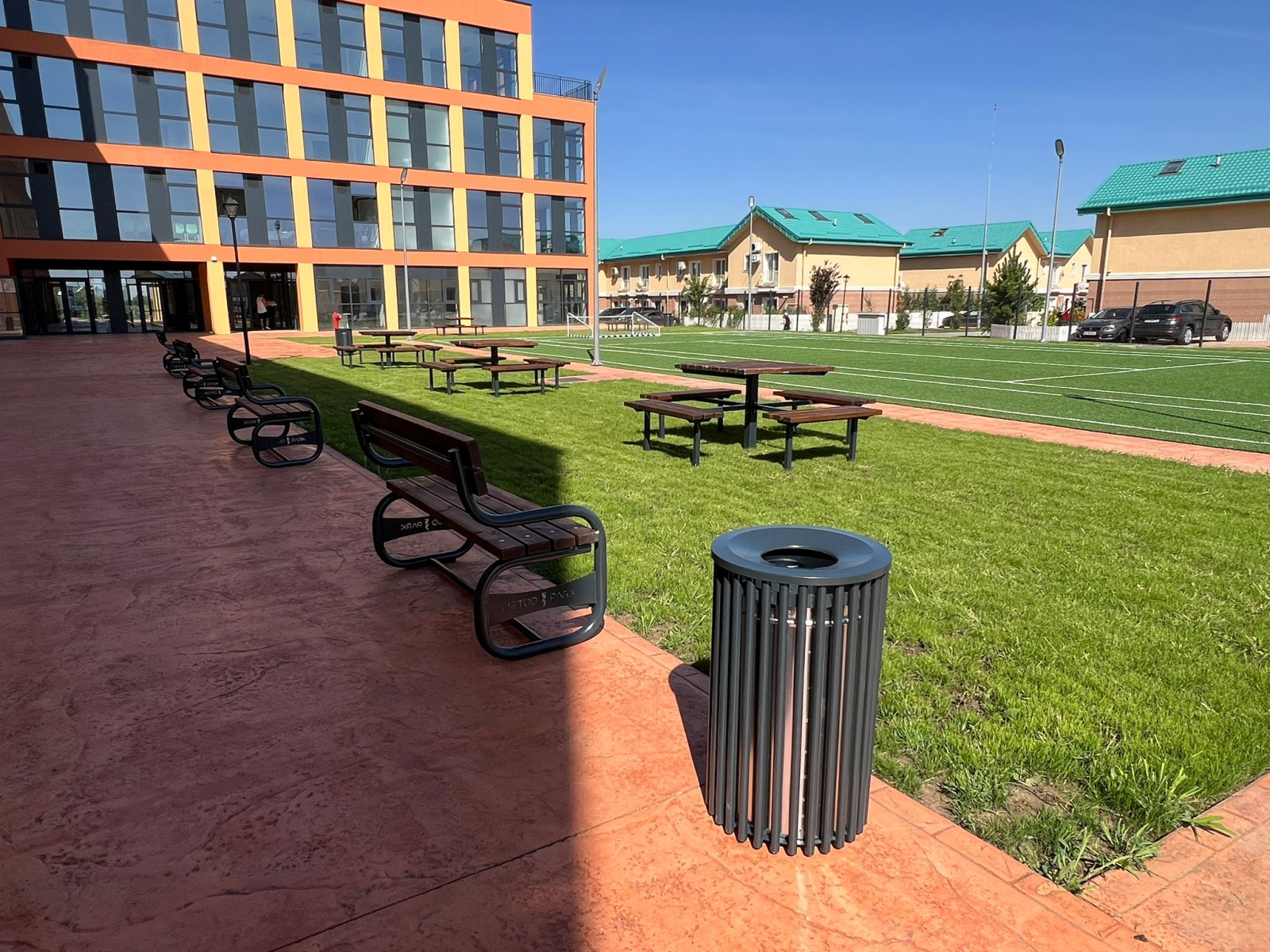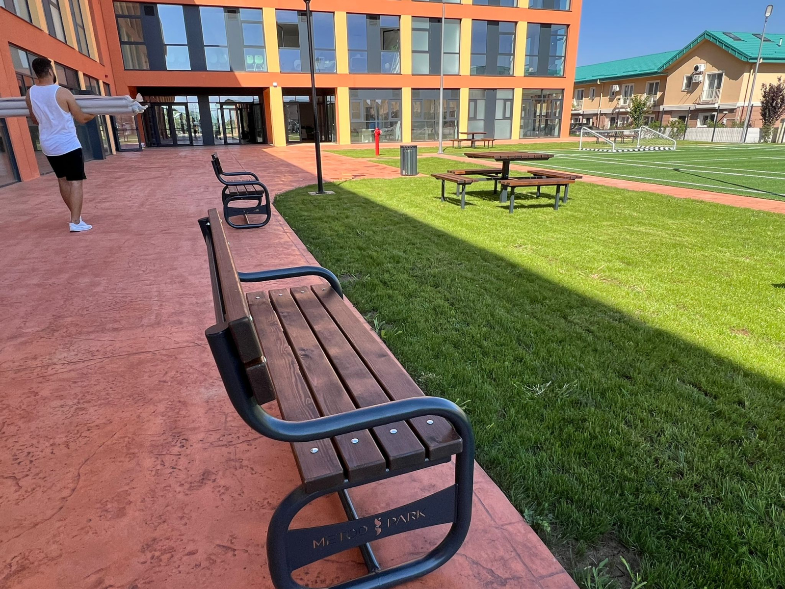 Amenajare mobilier urban exterior, format din banci, mese picnic si cosuri de gunoi în Cosmopolis.