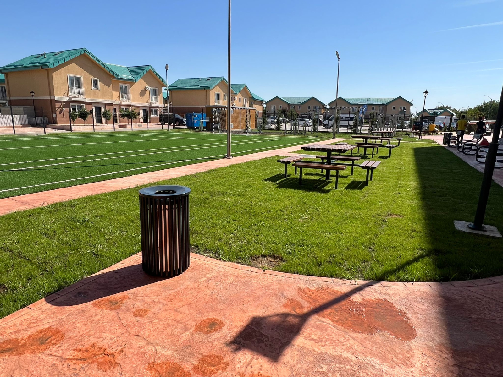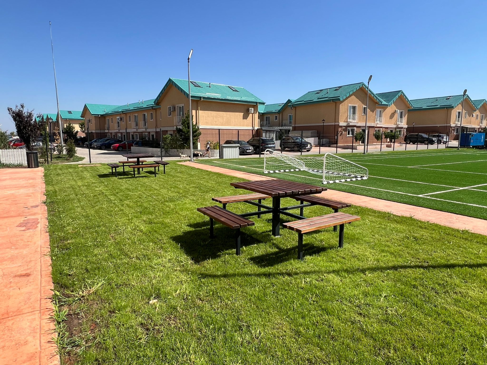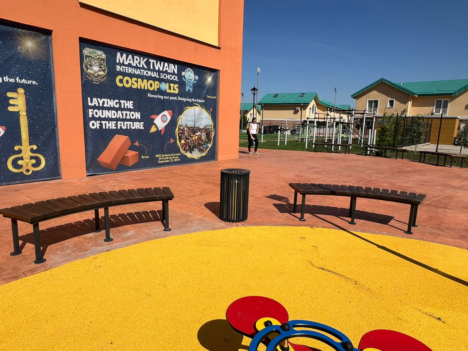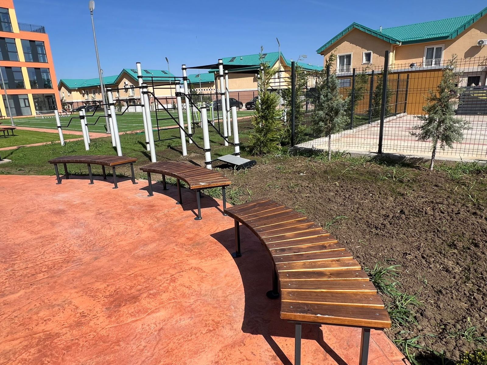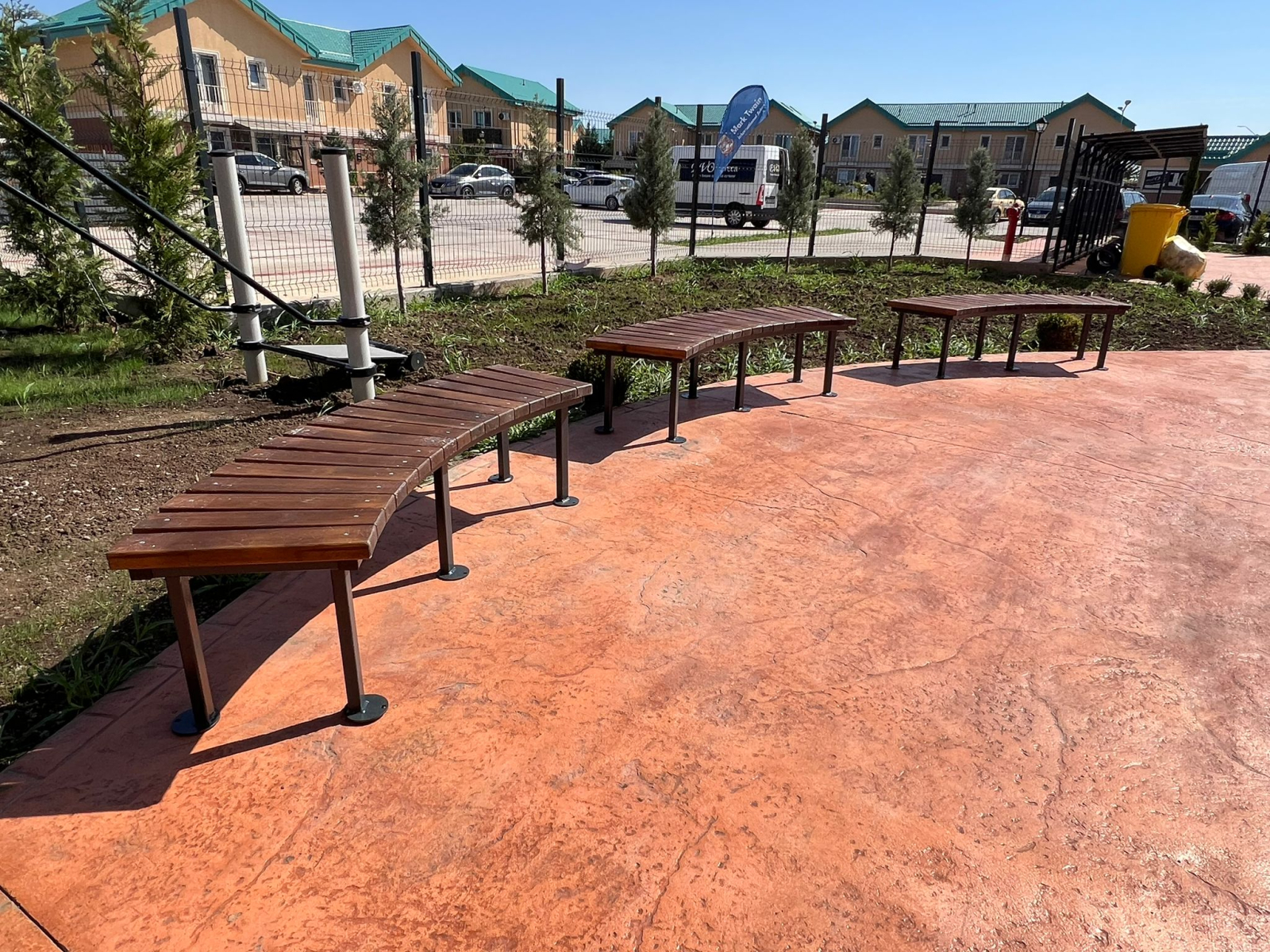Amenajare mobilier urban exterior, format din banci, mese picnic si cosuri de gunoi în Cosmopolis.